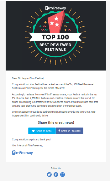 According to the report, Jagran Film Festival has ranked as one of the Top 100 Best Reviewed Festivals on FilmFreeway for the month of March. The review further states that from real FilmFreeway users, Jagran Film Festival ranks in the top 2% of more than 4,700 film festivals and creative contests around the world. The report goes on to credit the hard work, care and effort made by the team of Jagran which has helped the festival receive this accreditation and states their excitement to be associated with the event.