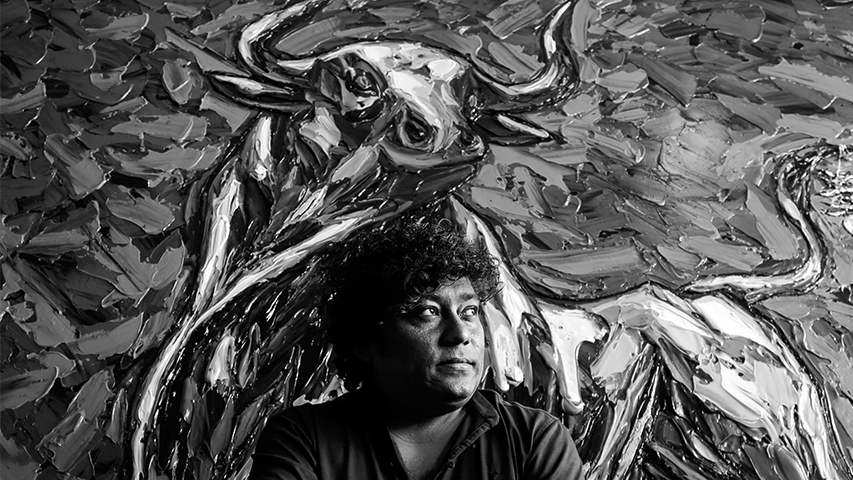 Lately, he has retured from an exhibition in Seoul to Mumbai’s crowded Kandivli neighbourhood, where he lives with his wife and two sons, and paints in an attached studio. His fiercely bold acrylic strokes on canvas with knives and masonry tools, are frequently double the size of the artist who’s a puckish, tousle-haired 5’ 4”.